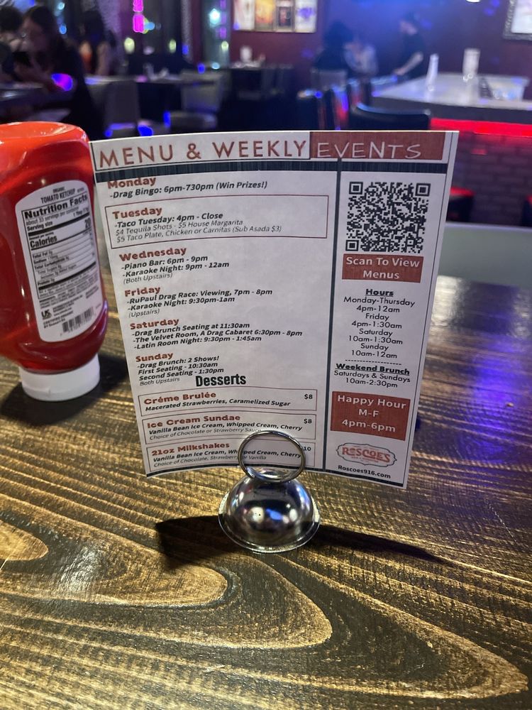“ I have been to Roscoe's MANY times since my first review. What did it for us is their Drag BINGO on Mondays. We love having something fun to do to break up the week and it's so nice to have something fun to look forward to each Monday. Drag BINGO is from 6-7:30pm every monday and there are four rounds, typically with free play (unless they're doing a fundraiser) and they have prizes for each round. If you come during this time be ready for a fun and loud environment. We still pop in on other nights and they have specials throughout the week as well as movie nights, Drag Brunch and watch parties. They definitely keep it active and fun for both the downstairs and upstairs space. The servers and bartenders are really friendly, be patient during really busy times as they can have a lot coming in all at once. They make some delicious cocktails and have beers on draft. One of my favorites is the Dirty Linen, but all the 21oz specialty cocktails are delicious and HUGE. They also offer mocktails, milkshakes and wine. The milkshakes are one of my favorite treats here too. The food is bar food with a few twists that make them their own. The mac and cheese is really good and the chicken strips are thin and crispy with a cornflake breading and hot honey. We like ordering the Appetizer sampler to share and it comes with fries, onion rings, mozzarella sticks and some chicken. The burgers are also good. If it's your first time here, take a moment to look around at all the photos and posters around the bar. It's decorated downstairs and upstairs and is such a vibe. ”